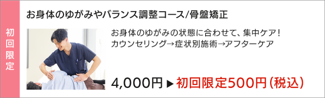 | お身体のゆがみやバランス調整コース/骨盤矯正 | 500円 | 4,000円 |