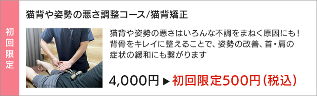 | 猫背や姿勢の悪さ調整コース/猫背矯正 | 500円 | 4,000円 |